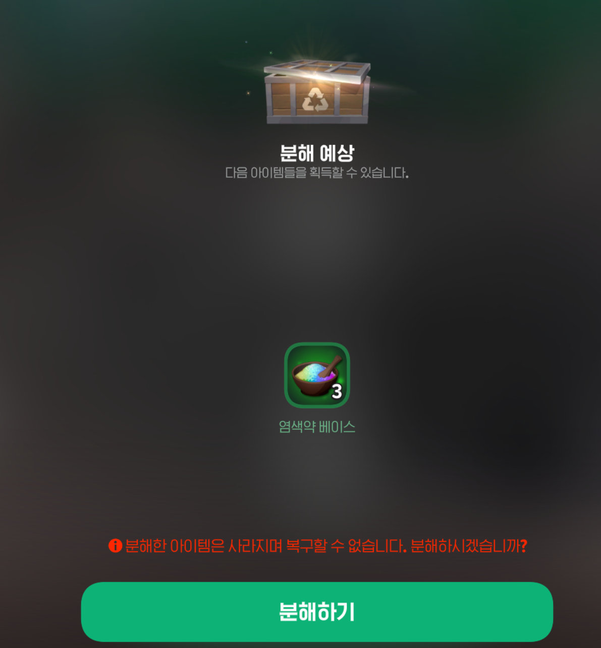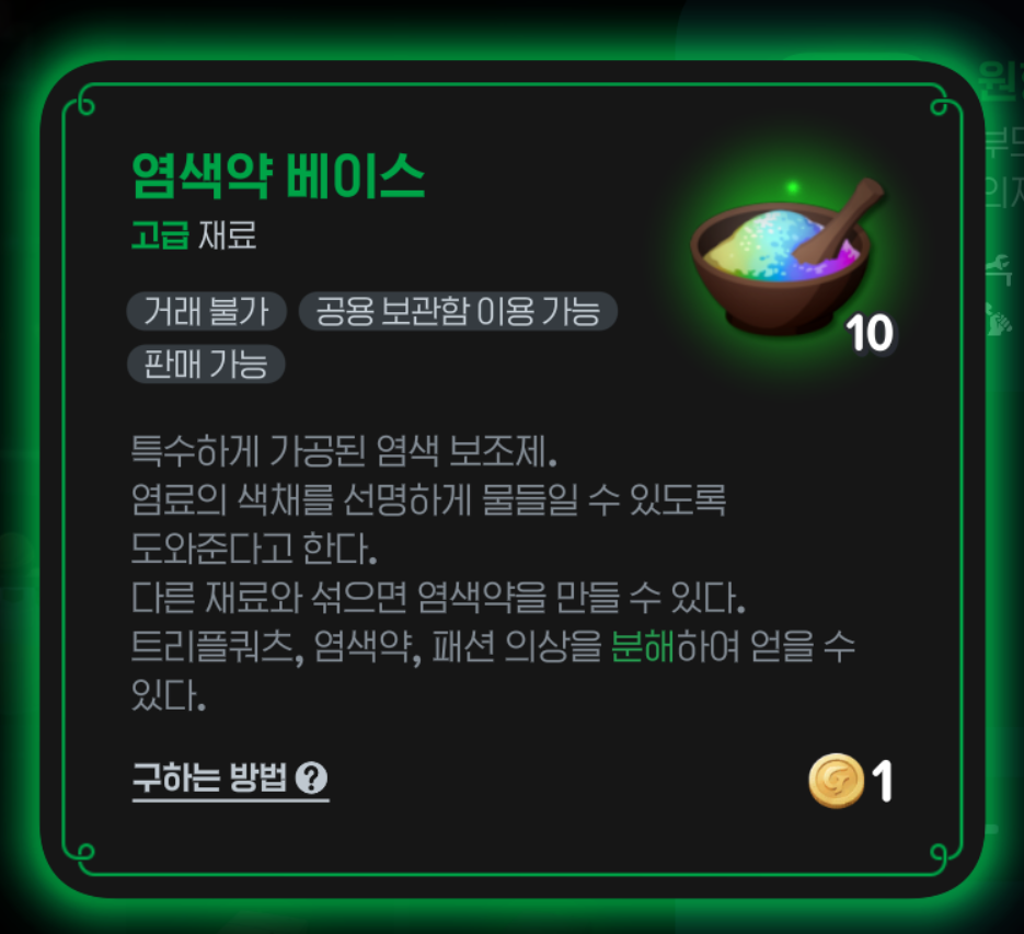 | 염색약 베이스 | 10개 | 패션 아이템 분해 |