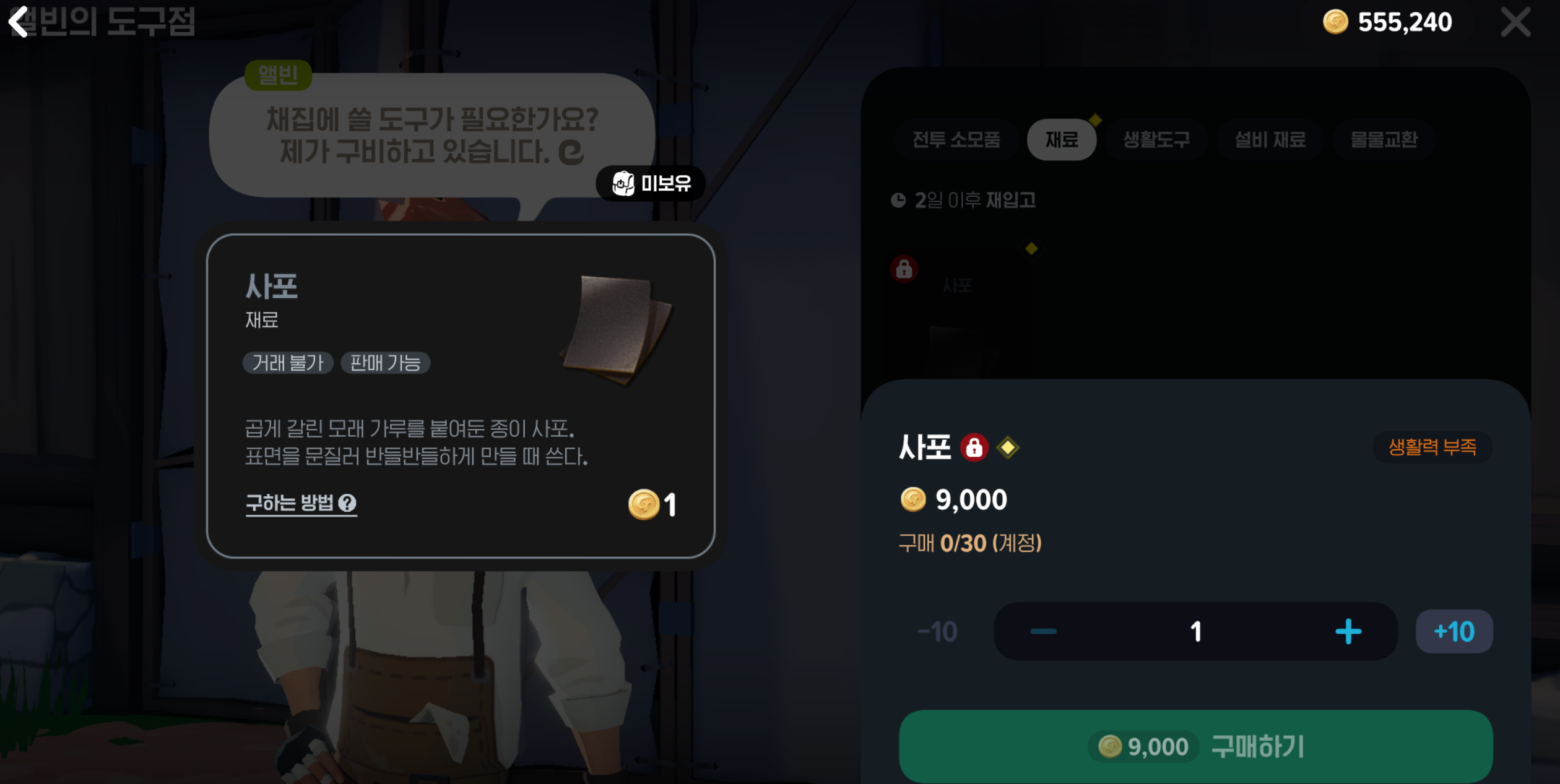| 못 | 20개 | 잡화 상점 or 제작 |