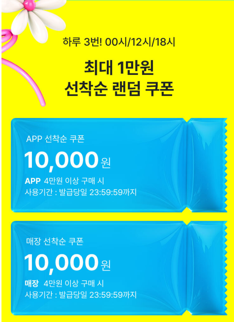 - 선착순 쿠폰 대폭 확대: 하루 3번(00시, 12시, 18시), 최대 1만 원 할인 쿠폰 지급